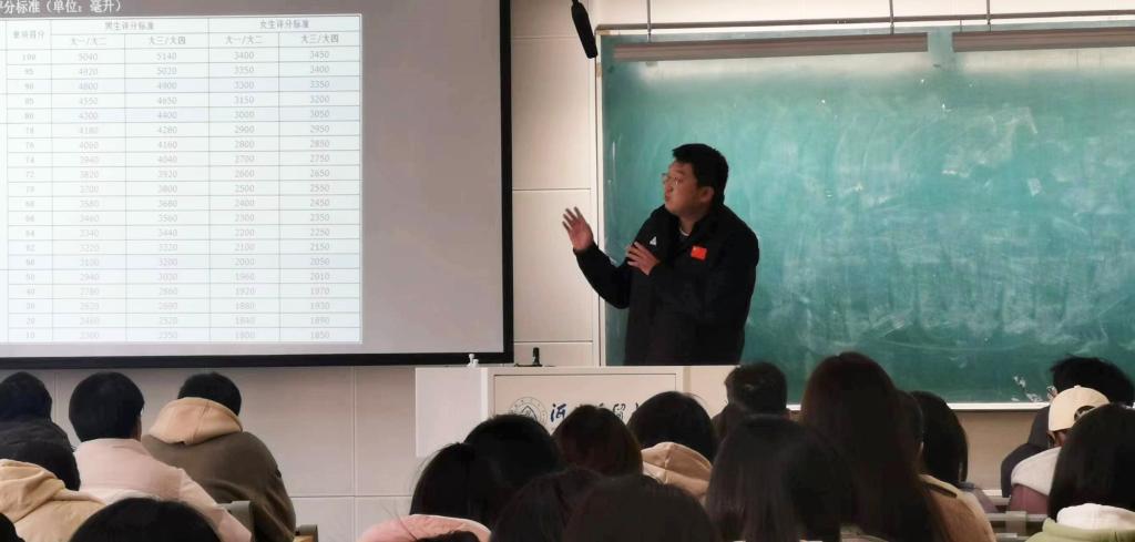 李若玉从体测的政策依据、体测的评分标准、体测的重要意义等三个方面进行了讲解,重点介绍了体测各个项目的比例构成,并以体测过程中同学们容易出现的问题为例,现场示范了坐位体前屈、立定跳远、跑步等项目的动作要领和得分技巧。他讲到,体测是从身体形态、身体机能和身体素质等方面对老员工的体质健康进行综合评定,是促进老员工体质健康发展、激励员工进行体育锻炼的教育手段。同学们对体测要有正确的认知,以积极的心态投入到体育锻炼中,在体测中获得好成绩,同时,通过体测赢得健康的体魄,为老员工活夯实身体基础。在互动答疑环节,李若玉对同学们提出的问题进行了耐心细致的解答。