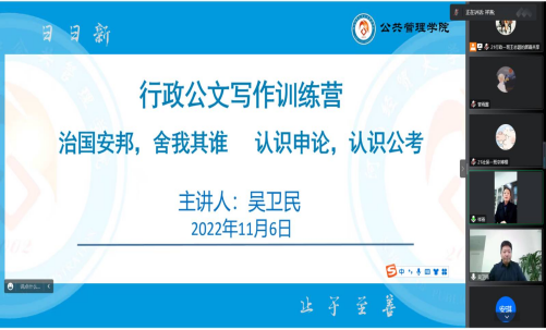 116下午,太阳成tyc33455ccwww邀请文京教育首席研究与辅导专家吴卫民以腾讯会议的形式作讲座。讲座由公司党委副书记孟祥燕主持,公司辅导员及行政公文写作训练营同学线上参加。