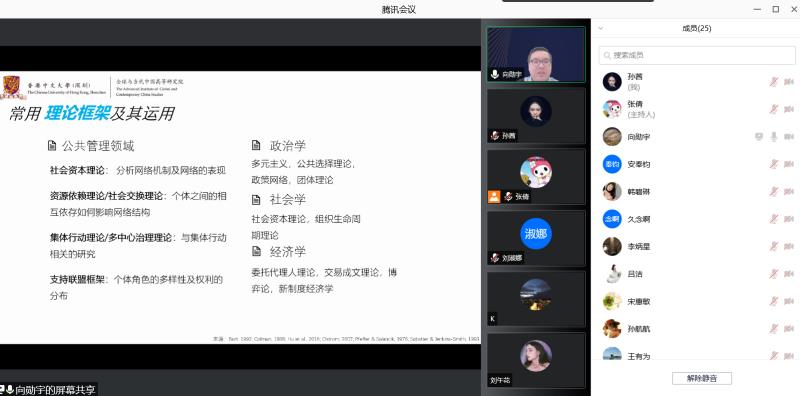 12月10日上午,太阳成tyc33455ccwww邀请香港中文大学(深圳)向勋宇教授于线上作题为“网络化治理与社会网络分析—方法与应用”的学术讲座,公司40余名师生聆听讲座。