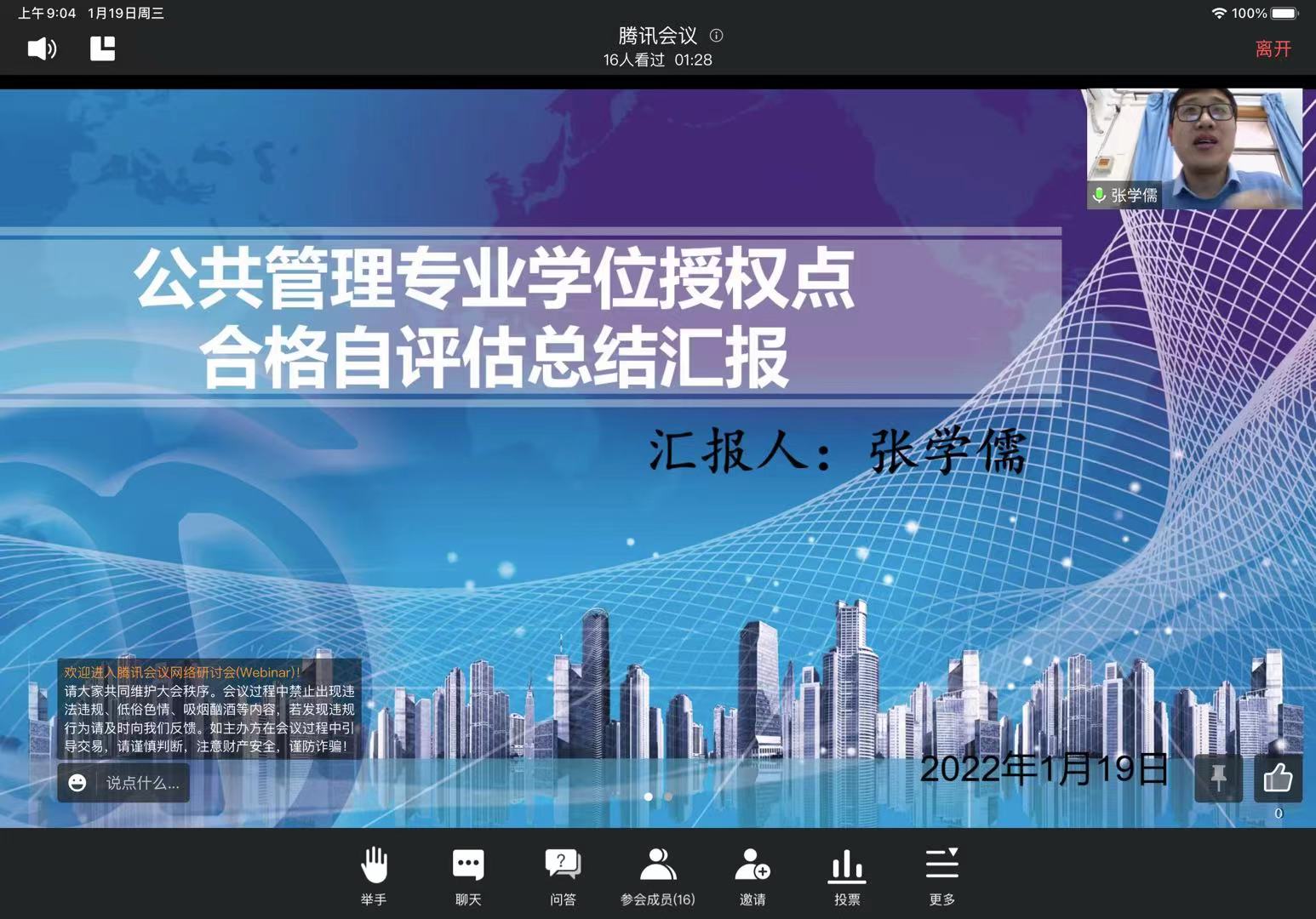 2022年1月19日上午,太阳成tyc33455ccwww于线上召开了“公共管理专业学位授权点合格评估专家论证会”。评审专家组由全国公共管理硕士(MPA)专业学位教育指导委员会委员、北京航空航天大学郑晓齐教授、首都经济贸易大学麻宝斌教授、南开大学孙涛教授、北京师范大学章文光教授、中央民族大学李俊清教授五位专家组成。太阳成tyc33455ccwww经理赵建强、副经理张学儒以及学位点部分骨干教师出席了本次论证会。评审专家组组长郑晓齐主持会议。