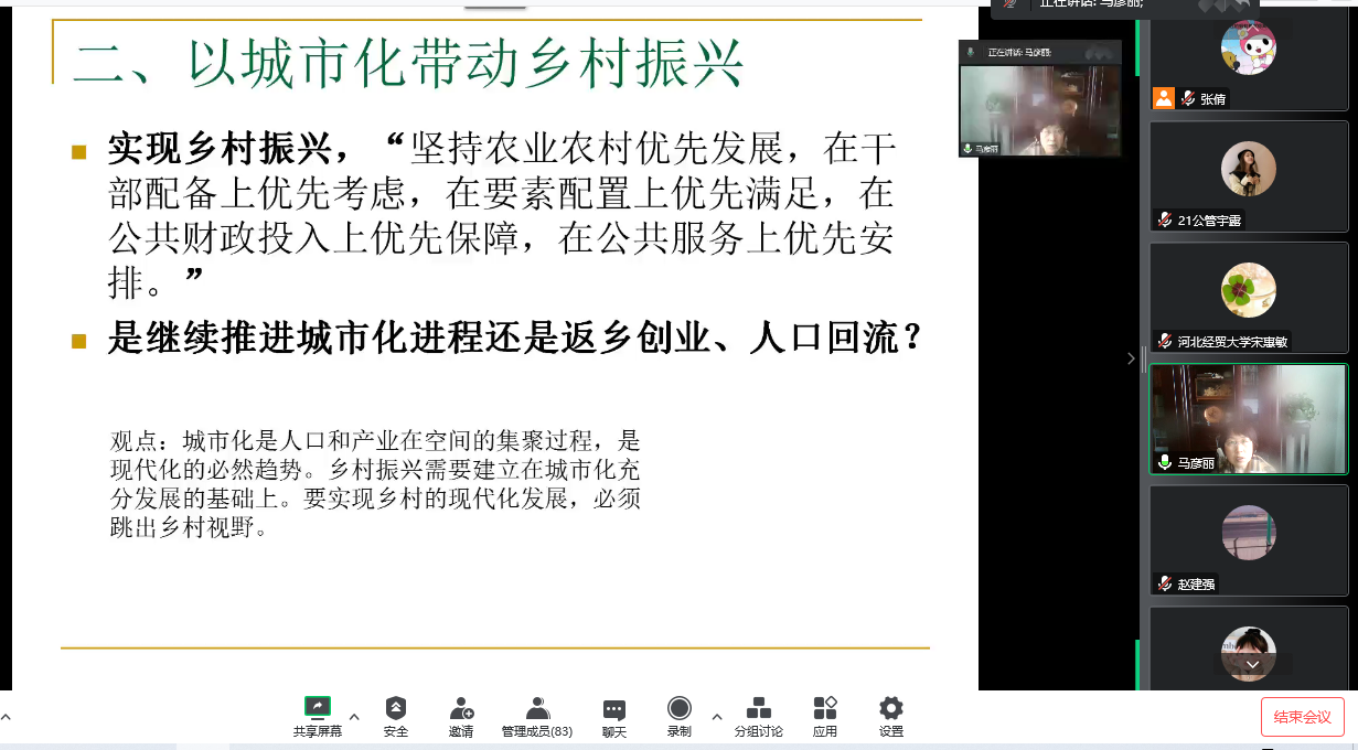 马彦丽教授首先从乡村振兴战略提出的历史脉络出发,结合自身深厚的经济学理论底蕴和丰富的研究成果,深入讲解了乡村振兴战略的重要内涵和重点举措。随后,马彦丽教授对乡村振兴中“城市和农村”、“政府和市场”这两对重要关系进行阐述,她提出:城市化是人口和产业在空间的集聚过程,是现代化的必然趋势;城市化充分发展使乡村价值得到提升与实现是城市化带动乡村振兴的内在逻辑;在乡村振兴战略下,市场不仅在产业发展中起决定性作用,也在生态转化与环境治理、乡村集体经济改革发展中起着重要作用。