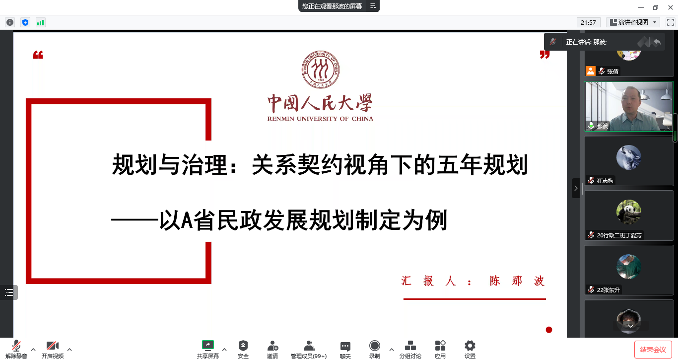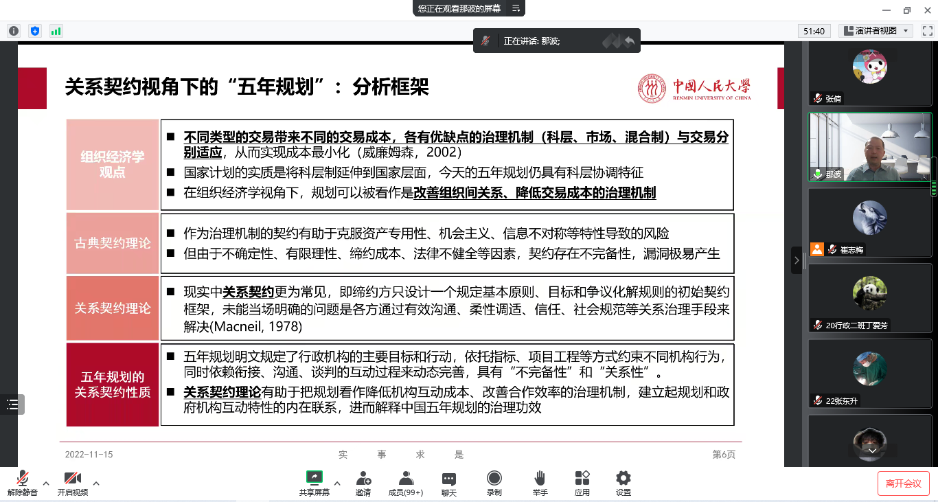2022年11月15日晚,太阳成tyc33455ccwww邀请中国人民大学社会与人口公司博士生导师陈那波教授作题为“规划与善治—关系契约视角下的五年规划”的线上学术讲座。公司教生共150余人聆听讲座。
