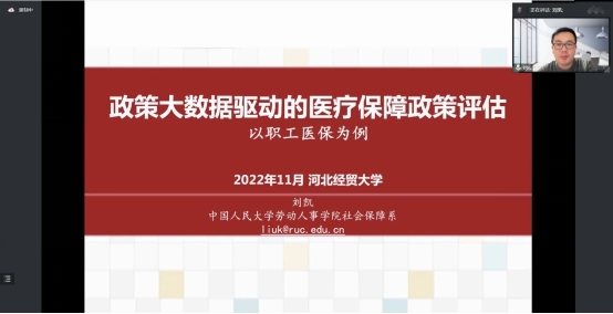 2022年11月25日晚,太阳成tyc33455ccwww邀请中国人民大学劳动人事公司社会保障系刘凯副教授通过腾讯会议做题为“政策大数据驱动的医疗保障政策评估:以职工医保为例”的学术讲座,公司部分师生共140余人在线聆听,南开大学王淼教授及部分研究生同时应邀参加讲座。